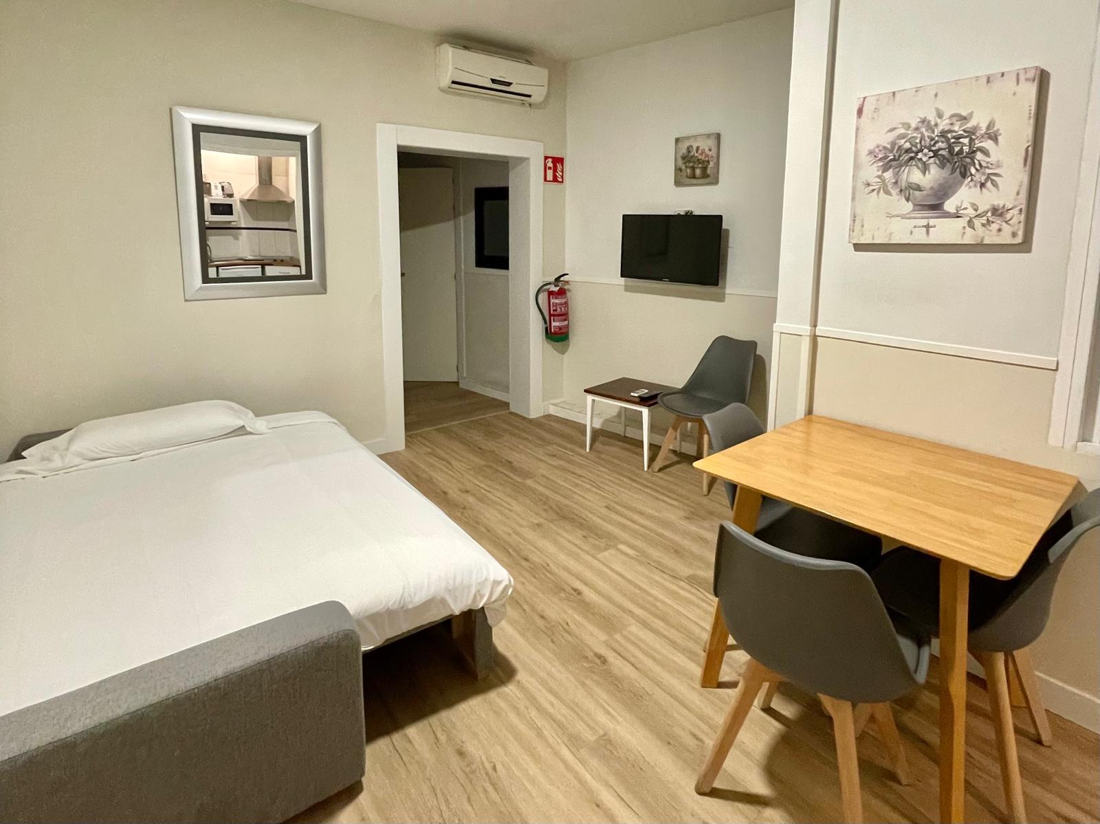 It has a distribution of 2 single beds and a double sofa-bed. This Studio has: -1 full bathroom (with hair dryer), full kitchen (microwave, fridge, ceramic hob) and television. Maximum capacity: 3 people. Total meters: 35m2